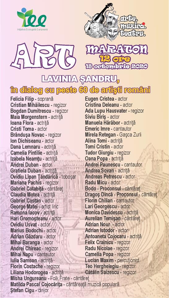 Un număr de peste 60 de actori, regizori, interpreți, artiști plastici, jurnaliști au fost invitații Laviniei Șandru într-un eveniment maraton care s-a încheiat astăzi. În emisiunea care a durat, fără întrerupere, peste 12 ore, aceștia au povestit Laviniei Șandru gândurile lor în acest moment de cumpănă pentru sectorul cultural, practic închis de pandemia de coronavirus.
