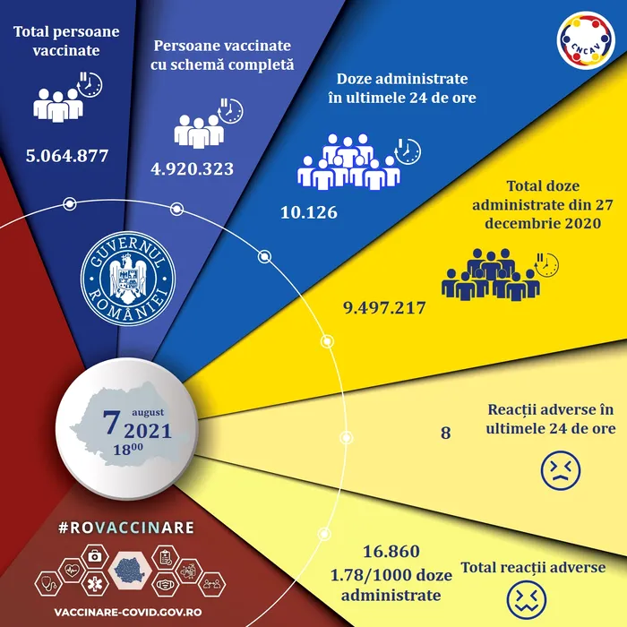 Comitetul Național de Coordonare a Activităților de Vaccinare (CNCAV) a anunțat sâmbătă, 7 august, că 10.126 de persoane s-au vaccinat anti-Covid în România, în ultimele 24 de ore.