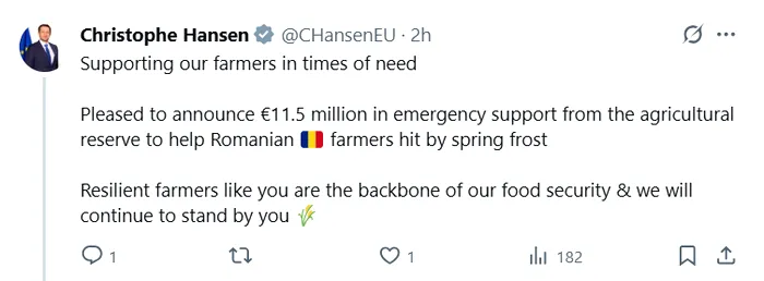 „Ne bucurăm să anunțăm acordarea unui ajutor de urgență de 11,5 mil.EUR din rezerva agricolă pentru a ajuta fermierii din România. Fermierii sunt coloana vertebrală a securității noastre alimentare și vom continua să vă sprijinim”, a mai scris Christophe Hansen.
