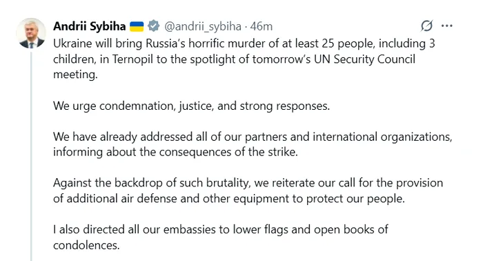 „Ucraina va aduce în centrul atenției, la reuniunea Consiliului de Securitate al ONU de mâine, uciderea a cel puțin 25 de persoane, inclusiv 3 copii, de către forțele ruse în orașul Ternopil.