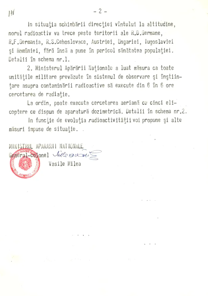 Arhivele Naționale ale României au făcut public și raportul din 30 aprilie 1986, întocmit de general colonel Vasile Milea, ministrul apărării naționale, cu privire la informațiile obținute prin sistemul de ascultare radio referitoare la accidentul nuclear de la Cernobîl, precum și la măsurile luate de Ministerul Apărării Naționale, însoțit de trei anexe.