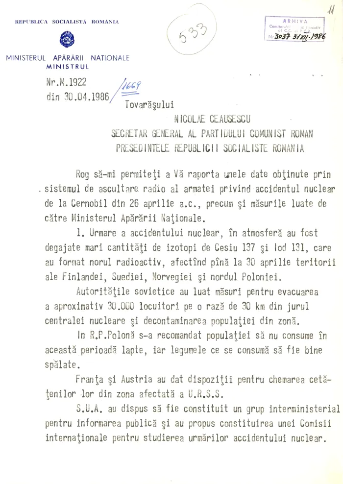 În data de 26 aprilie 1986 s-a produs explozia reactorului 4 de la Centrala Atomoelectrică Cernobîl. În acest context, Arhivele Naționale ale României au pus la dispoziție câteva documente care ilustrează maniera în care au reacționat inițial autoritățile din țara noastră în baza informațiilor de care dispuneau.