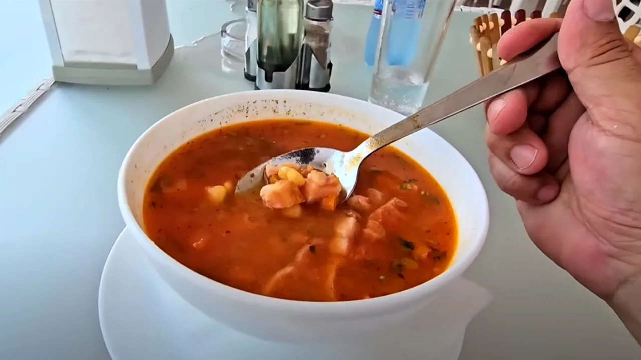 „A venit ciorba și este o porție mare, văd că are și ceva bacon pe interior, e destul de bogată și arată bine, chifla este veche. Ciorba nu e rea la gust, dacă mai pun puțină sare și piper, și am și ceapă, chiar o să fie bună. Vedem la sfârșit și cât costă. I-am pus sare și piper și este o ciorbă bună. De pâine nu o să mă ating, că este veche, ceapa încă nu a ajuns, dar e o ciorbă bună: 7 din 10. A venit și salata de ceapă, nu avea nimic decât pătrunjel, i-am pus eu sare și piper, și puțin ulei.