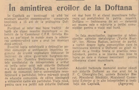 „În fața muncitorilor, inginerilor și tehnicienilor uzinelor metalurgice „Vasile Roaită”, tov. Mircea Radian, activit de partid, a vorbit despre lupta comuniștilor care în închisoarea sinistră a Doftanei au găsit răgazul de a învăța teoria și practica revoluționară, pentru a se înarma mai bine în lupta pe care o duceau necontenit pentru eliberarea clasei muncitoare. Adunări închinate memoriei eroilor căzuți sub zidurile Doftanei au mai avut loc la F.C. Gheorghiu Dej, uzinele Boleslav Bierut, Ministerul Sănătății, Ministerulul Comerțului Exterior și în alte întreprinderi și instituții din Capitală”, se încheia articolul citat.