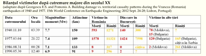 Seismul din 10 noiembrie 1940, cu magnitudine-moment de 7,7, a fost cel mai puternic (ca energie eliberată) din secolul XX, fiind urmat de cel din 4 martie 1977, cu magnitudine-moment de 7,4, dar care a fost cel mai distructiv cutremur din România. În rapoartele oficiale finale se menționează 1.578 de morți și 11.321 de răniți la nivel național, din care 1.424 de morți (90% din total) și 7.598 de răniți în București.