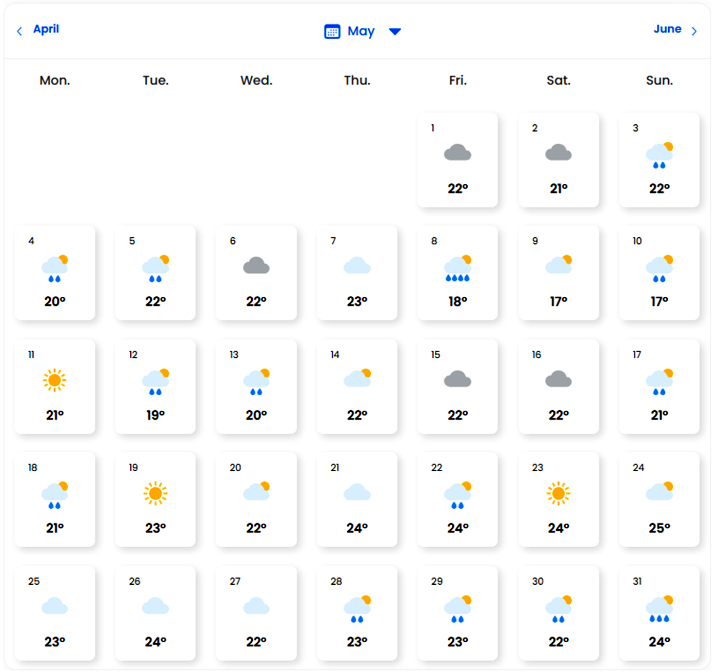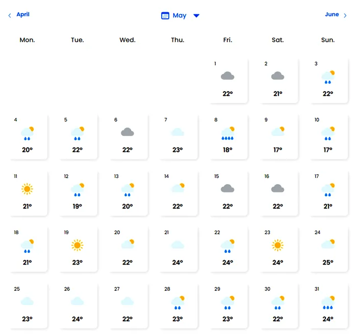 Vremea se va menține ploioasă și în luna ai 2026, în Capitală. Prima săptămâna a lunii mai aduce precipitații și temperaturi maxime de 22-23 de grade Celsius. După câteva zile în care soarele va ieși timid, pe alocuri, meteorologii anunță alte momente cu cer înnorat și precipitații. Temperaturile vor fi situate între 17 și 25 de grade Celsius. Va ploua în zilele de 3, 4, 5, 8, 10, 12, 13, 17, 18, 22, 28, 29, 30 și 31 mai 2026.