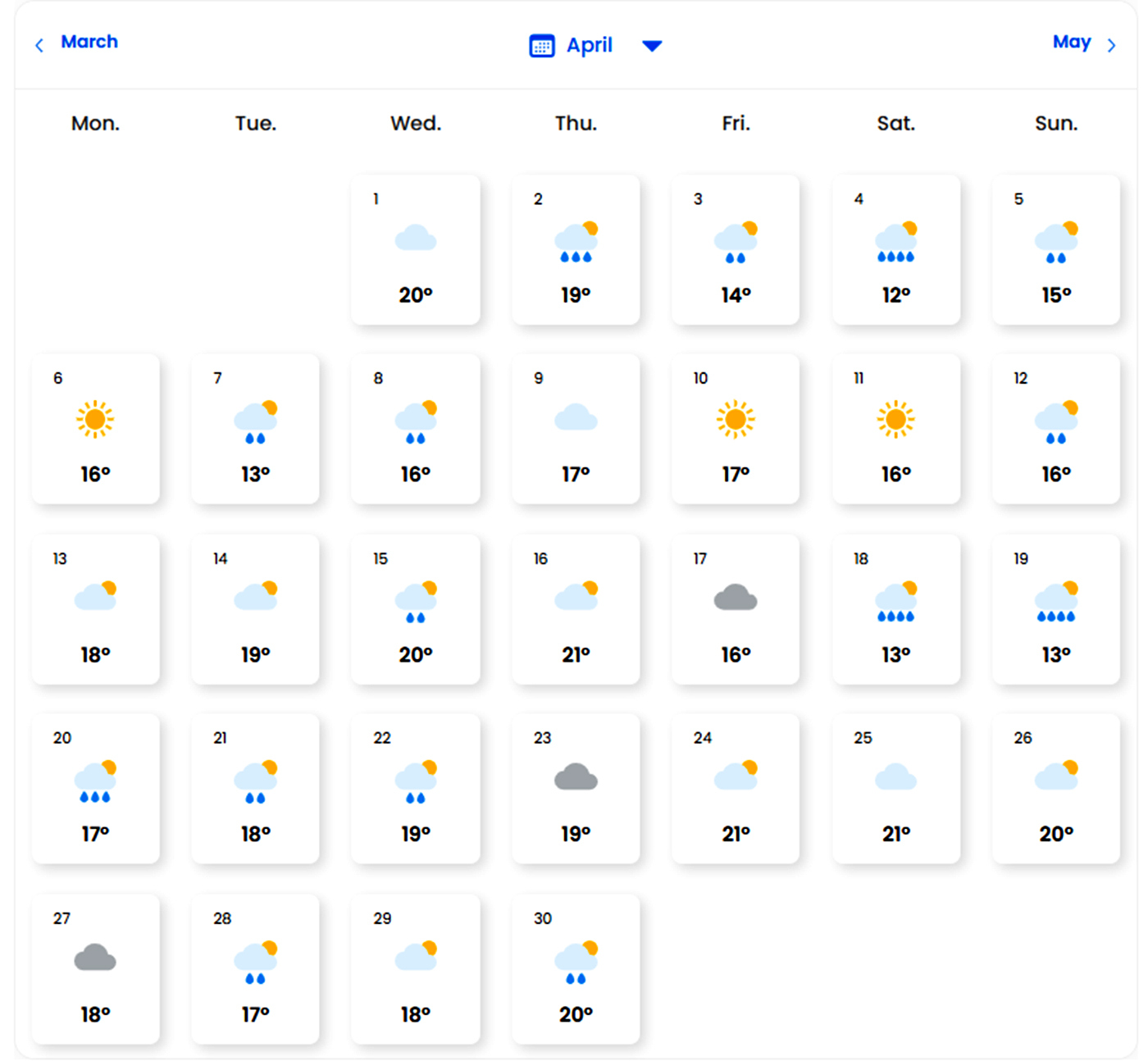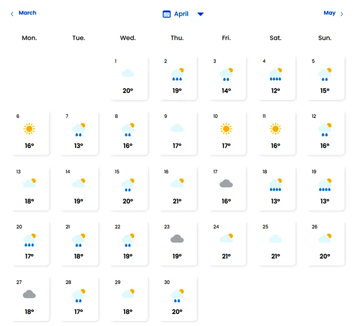 Luna aprilie 2026 aduce mai multe zile ploioase în București, arată prognoza meteo. Precipitații se vor înregistra în zilele de 2, 3, 4, 5, 7, 8, 12, 15, 18, 19, 20, 21, 22, 28 și 30 aprilie 2026. Temperaturile maxime vor fi situate între 12 și 21 de grade Celsius. Vremea se va menține parțial înnorată.