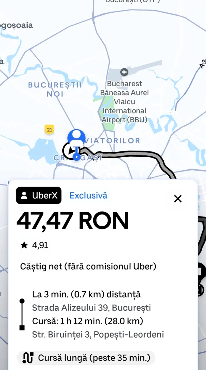 Un client a avut norocul să plătească numai 47,47 de lei, pe o distanță de 28 de kilometri care a durat o oră și 12 minute, până în Popești Leordeni.