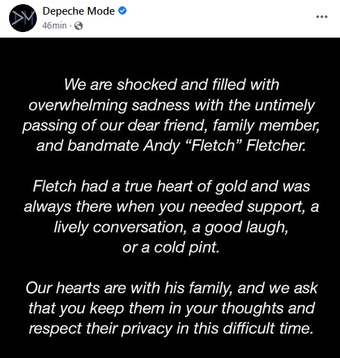 „Suntem şocaţi şi deosebit de trişti pentru trecerea în nefiinţă prea devreme a dragului nostru prieten, membru al familiei şi coleg Andy «Fletch» Fletcher”. Fletch a avut o inimă de aur, era mereu alături când aveai nevoie de sprijin, de o conversaţie spirituală, de distracţie sau de o bere rece. Inimile noastre sunt alături de familia sa, spre care să vă îndreptaţi gândurile voastre şi să le respectaţi intimitatea în aceste clipe”, au scris colegii săi pe rețeaua de socializare.