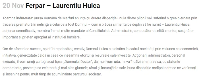 „Toamna îndurerată: Bursa Română de Mărfuri anunță cu durere dispariția unuia dintre pilonii săi, suferind o grea pierdere prin trecerea prematură în neființă a celui ce a fost Domnul – cum îi plăcea și merita pe deplin să fie numit – Laurențiu Huică, acționar semnificativ, membru în mai multe mandate al Consiliului de Administrație, conducător de elită, mentor, susținător important și prieten apropiat al instituției bursiere.