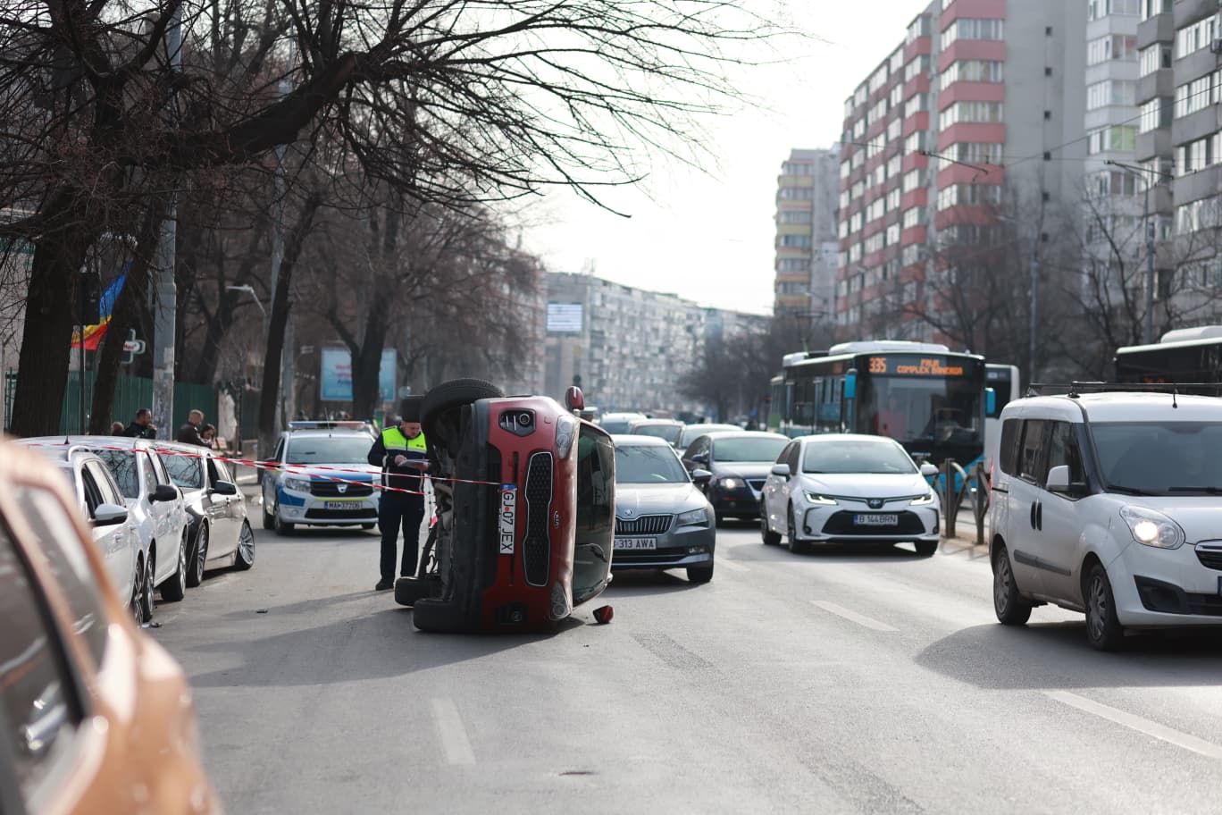 Polițiștii rutieri ajunși la fața locului au constatat că cele sesizate se confirmă, fiind vorba de un accident de circulație, în care au fost implicate trei autovehicule aflate în mișcare și trei staționate, iar din impact un autovehicul s-a răsturnat pe partea laterală stânga.