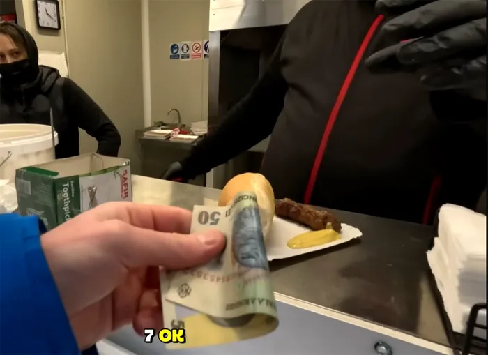 Desigur, nu poți mânca fără o bere, au și o bere daneză, coada din spatele meu se face tot mai mare, aștepți cam 15 minute. Deci costul total al acestei mese a fost de 15 lei. Să gustăm. Wow e foarte delicat și are un gust incredibil. Am auzit că e obligatoriu să îl mănânci cu muștar. Nu sunt sigur dacă carnea e doar carne sau are și brânză în interior. Condimentele sunt blânde. Aș putea mânca asta la prânz și la cină, fără vreo diferență”, spune acesta în vlogul său.