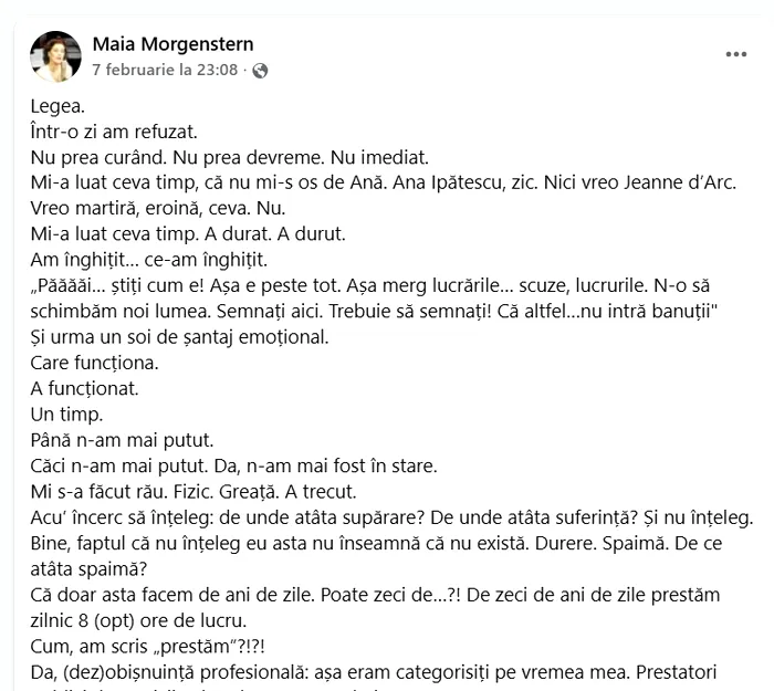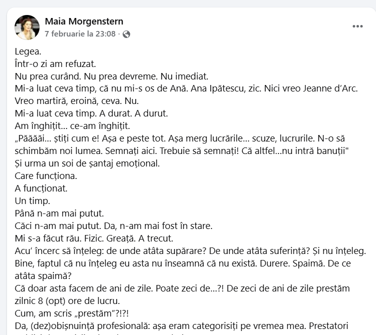 Nici artiştii nu au stat cu mâinile în sân. Fiecare a postat pe pagina sa de Facebook un mesaj în care îşi declară dezacordul cu privire la aceste măsuri legislative. Unul dintre cei mai cunoscuţi artişti, care a fost şi director de teatru, este şi Maia Morgenstern care cere schimbarea legii după care funcţionează instituţiile de cultură: