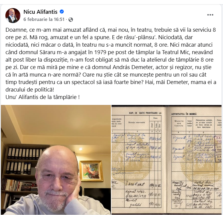 „Doamne, ce m-am mai amuzat aflând că, mai nou, în teatru, trebuie să vii la serviciu 8 ore pe zi. Mă rog, amuzat e un fel a spune. E de râsu’-plânsu’. Niciodată, dar niciodată, nici măcar o dată, în teatru nu s-a muncit normat, 8 ore. Nici măcar atunci când domnul Săraru m-a angajat în 1979 pe post de tâmplar la Teatrul Mic, neavând alt post liber la dispoziție, n-am fost obligat să mă duc la atelierul de tâmplărie 8 ore pe zi. Dar ce mă miră pe mine e că domnul András Demeter, actor și regizor, nu știe că în artă munca n-are normă? Oare nu știe cât se muncește pentru un rol sau cât timp trudești pentru ca un spectacol să iasă foarte bine? Hai, măi Demeter, mama ei a dracului de politică!