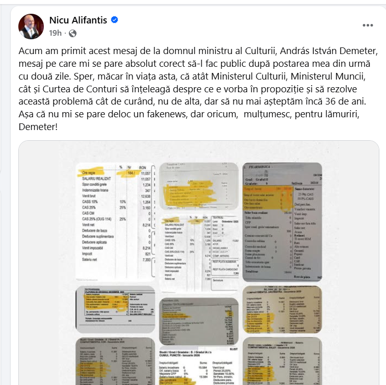 „Acum am primit acest mesaj de la domnul ministru al Culturii, András István Demeter, mesaj pe care mi se pare absolut corect să-l fac public după postarea mea din urmă cu două zile. Sper, măcar în viața asta, că atât Ministerul Culturii, Ministerul Muncii, cât și Curtea de Conturi să înțeleagă despre ce e vorba în propoziție și să rezolve această problemă cât de curând, nu de alta, dar să nu mai așteptăm încă 36 de ani. Așa că nu mi se pare deloc un fakenews, dar oricum, mulțumesc, pentru lămuriri, Demeter!”, spune cantautorul în cel de-al doilea mesaj postat recent.