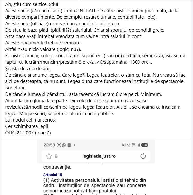 De când e și anume legea. Care lege?! Legea teatrelor, o știm cu toții. Nu vreau să fac aici pe deșteapta, că nu sunt. Legea după care funcționează instituțiile de spectacole. Bugetarii.
