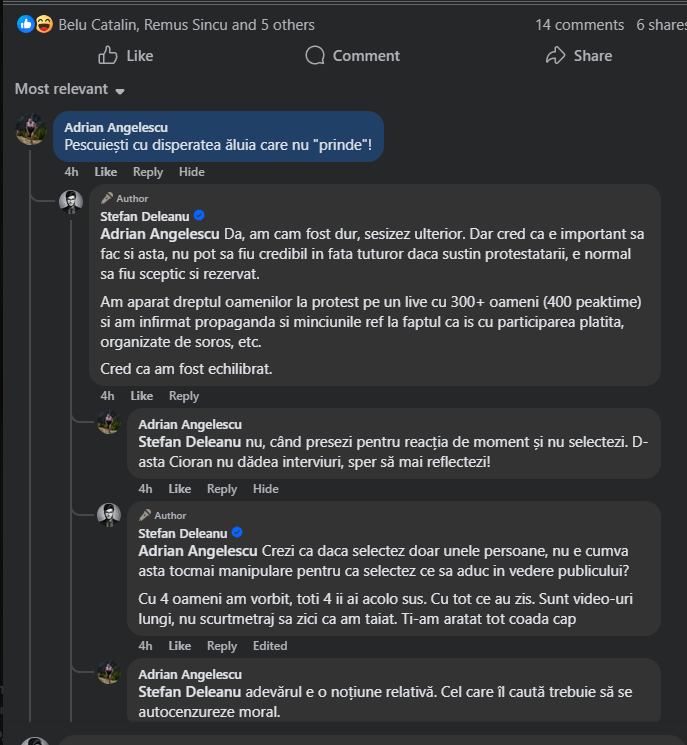 „Când presezi pentru reacția de moment și nu selectezi. D-asta Cioran nu dădea interviuri, sper să mai reflectezi!”, este unul dintre comentariile bărbatului care participă frecvent la manifestațiile Declic.