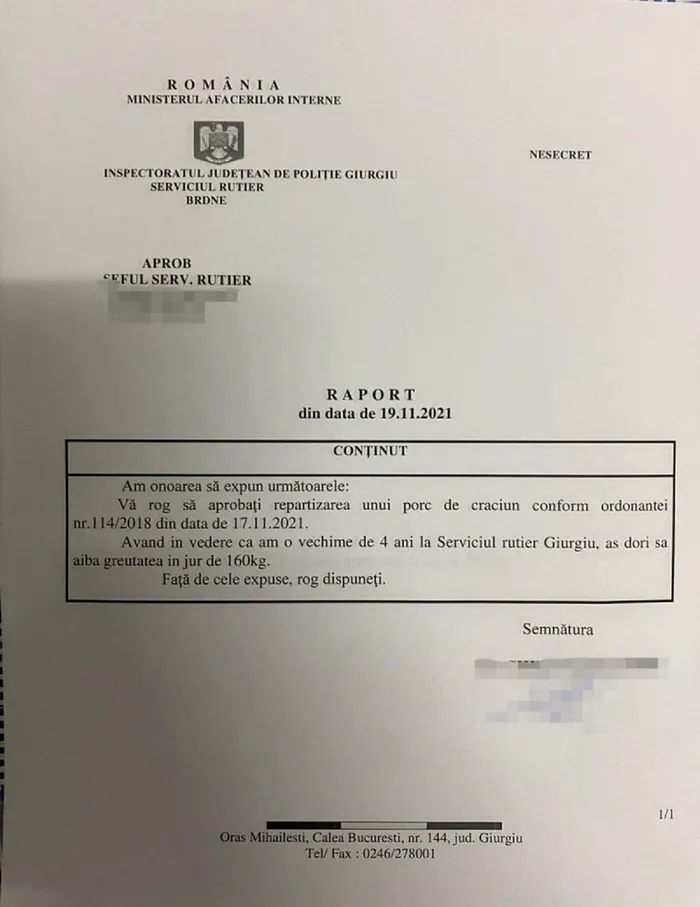 „Am onoarea să vă expun următoarele: Vă rog să aprobați repartizarea unui porc de Crăciun conform ordonanței nr. 114/2018 din data de 17.11.2021. Având în vedere că am o vechime de 4 ani la Serviciul Rutier Giurgiu, aș dori să aibă greutatea în jur de 160 kg. Față de cele expuse, rog dispuneți”, a scris agentul de poliție în raportul întocmit pe 19 noiembrie 2021.
