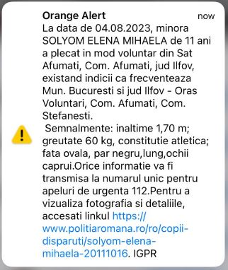 Autoritățile au transmis și un mesaj prin intermediul sistemului RO-Alert, solicitând sprijin din partea populației pentru găsirea fetei.