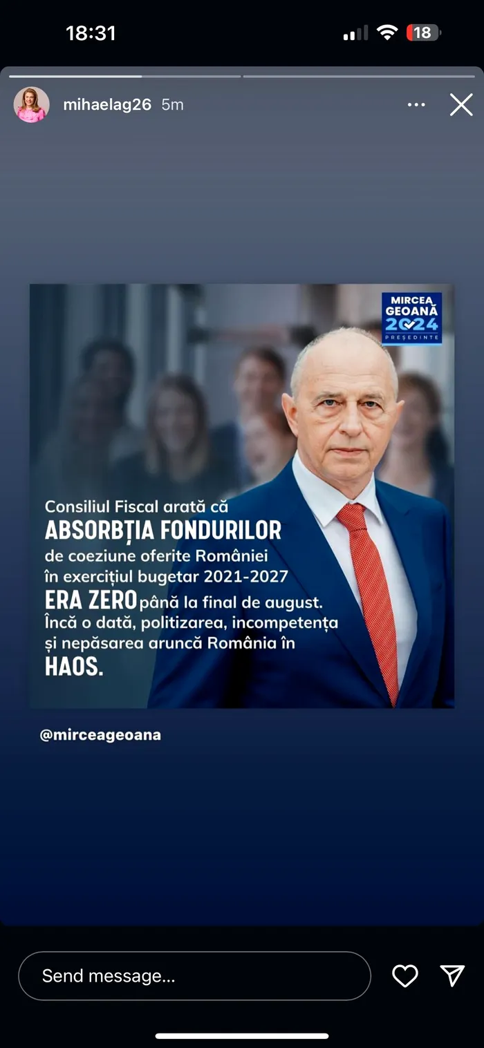 Adrian Câciu, ministrul Finanțelor, a reacționat ferm la afirmațiile făcute de Mircea Geoană și distribuite de soția acestuia, Mihaela Geoană, referitoare la stadiul absorbției fondurilor de coeziune pentru perioada 2021-2027. Geoană a afirmat că absorbția era zero până la finalul lunii august, acuzând politizarea și necompetența administrației actuale.