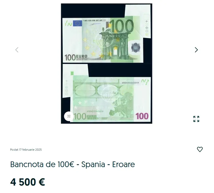 Bancnotă a fost emisă în Spania și are o mică eroare, astfel că nu poate fi introdusă în circuitul bancar și este comercializată pe un cunoscut site de comerț online.
