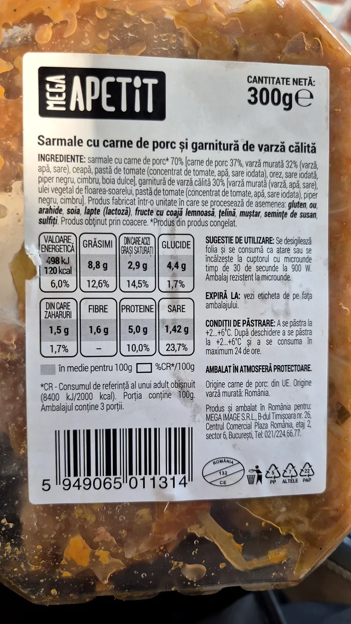 Sarmalele vândute la Mega Image au și o atenționare importantă pentru persoanele cu alergii sau intoleranțe alimentare – sunt fabricate într-o unitate care procesează, pe aceleași linii de producție, gluten, ou, arahide, soia, lapte (lactoză), fructe cu coajă lemnoasă, pește, muștar, susan și sulfiți. Din acest motiv, pot exista urme ale acestor alergeni în sarmalele care sunt vândute românilor.