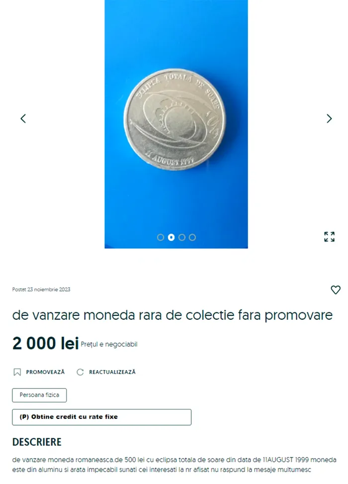 De exemplu, o monedă de 500 de lei cu Eclipsa totală de soare din România (1999) poate fi vândută la prețul de 2000 de lei.