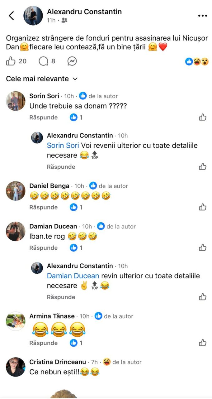 În postarea cu pricina, un bărbat, pe nume Alexandru Constantin, scrie: „Organizez strângere de fonduri pentru asasinarea lui Nicușor Dan. Fiecare leu contează, fă un bine țării.”