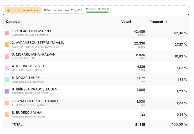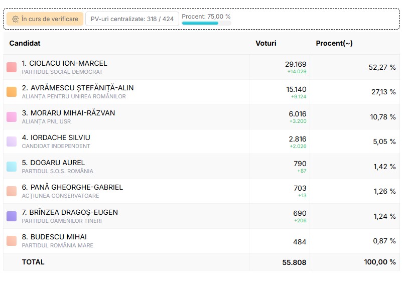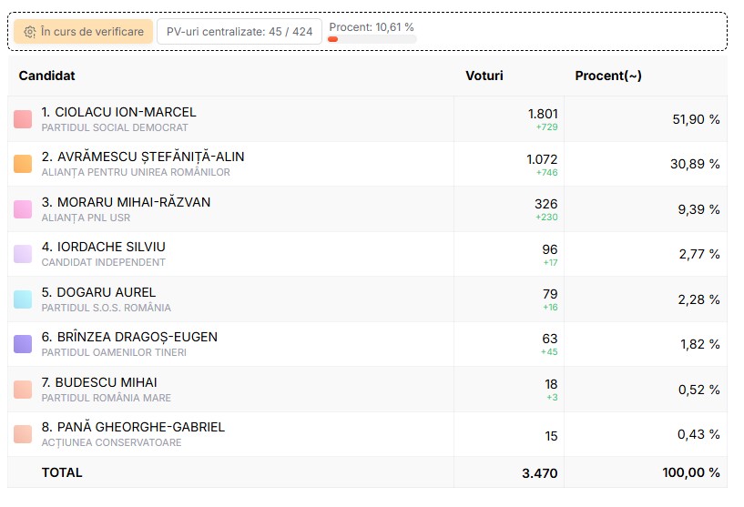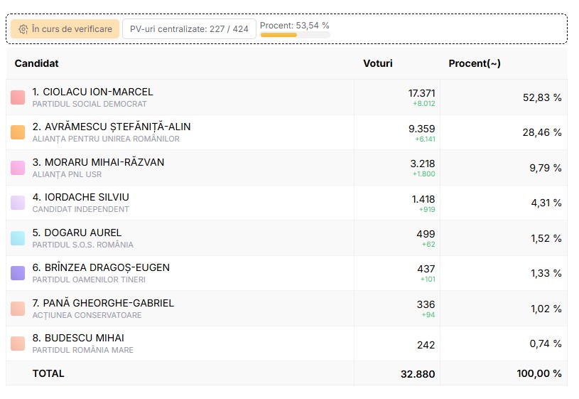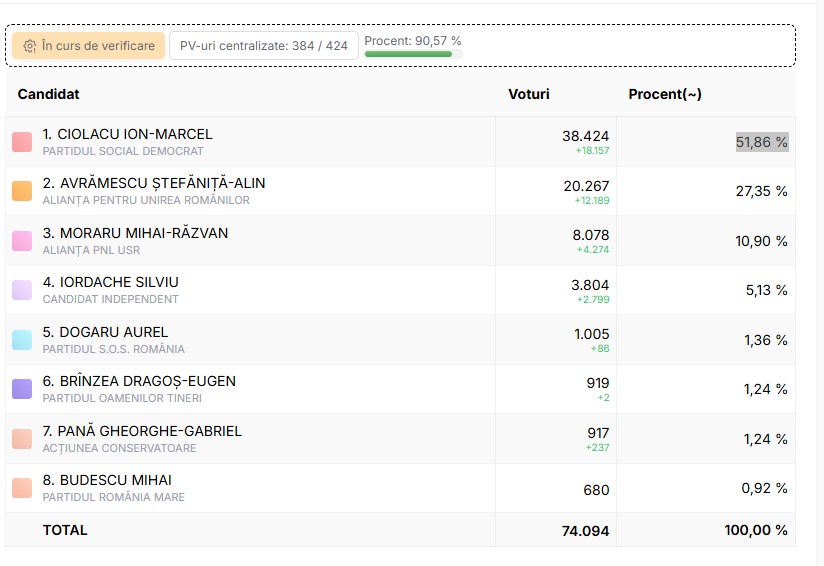Pe locul doi se află candidatul AUR, Alin-Ștefăniță Avrămescu, cu 24,86%, urmat de candidatul USR, Mihai-Răzvan Moraru, cu 9,85%.