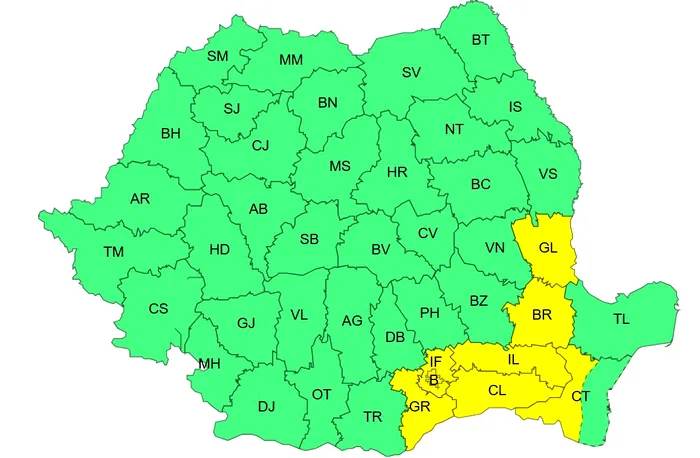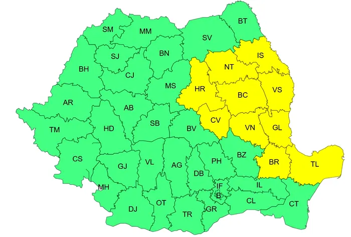 A fost emis un cod galben de instabilitate atmosferică, pentru ziua în curs, valabil în intervalul 12:00 – 21:00. Zone afectate sunt următoarele: nordul Crișanei, Maramureș, Transilvania, Oltenia, Moldova, Muntenia și Dobrogea.