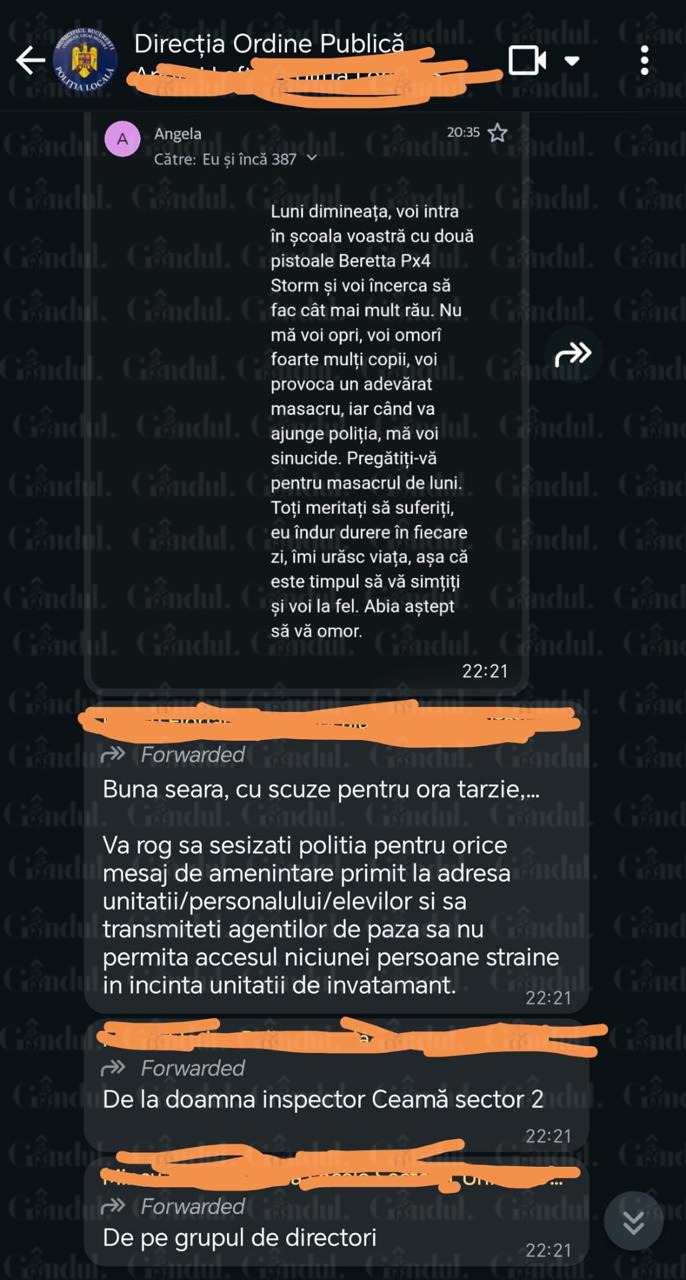 În urma mesajului, Inspectoratul Școlar al Sectorului 2 a transmis o alertă directorilor din școli, cerându-le să sesizeze imediat Poliția în cazul oricărei amenințări similare.