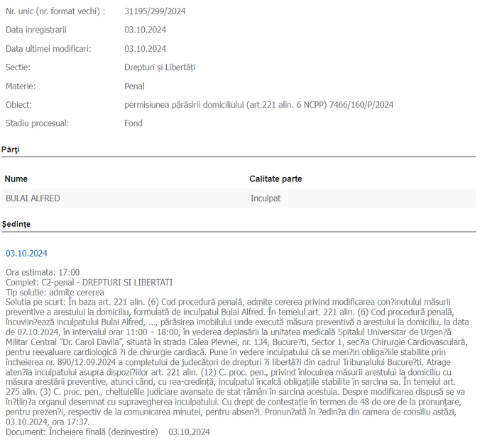 „În temeiul art. 221 alin. (6) Cod procedură penală, încuviin?ează inculpatului Bulai Alfred, …, părăsirea imobilului unde execută măsura preventivă a arestului la domiciliu, la data de 07.10.2024, în intervalul orar 11:00 – 18:00, în vederea deplasării la unitatea medicală Spitalul Universitar de Urgență Militar Central ”Dr. Carol Davila”, situată în strada Calea Plevnei, nr. 134, București, Sector 1, secția Chirurgie Cardiovasculară, pentru reevaluare cardiologică și de chirurgie cardiacă. Pune în vedere inculpatului că se mențin obligațiile stabilite prin încheierea nr. 890/12.09.2024 a completului de judecători de drepturi ?i libertă?i din cadrul Tribunalului București. Atrage atenția inculpatului asupra dispozițiilor art. 221 alin. (12) C. proc. pen., privind înlocuirea măsurii arestului la domiciliu cu măsura arestării preventive, atunci când, cu rea-credinţă, inculpatul încalcă obligaţiile stabilite în sarcina sa.”, se arată în decizia magistraților.