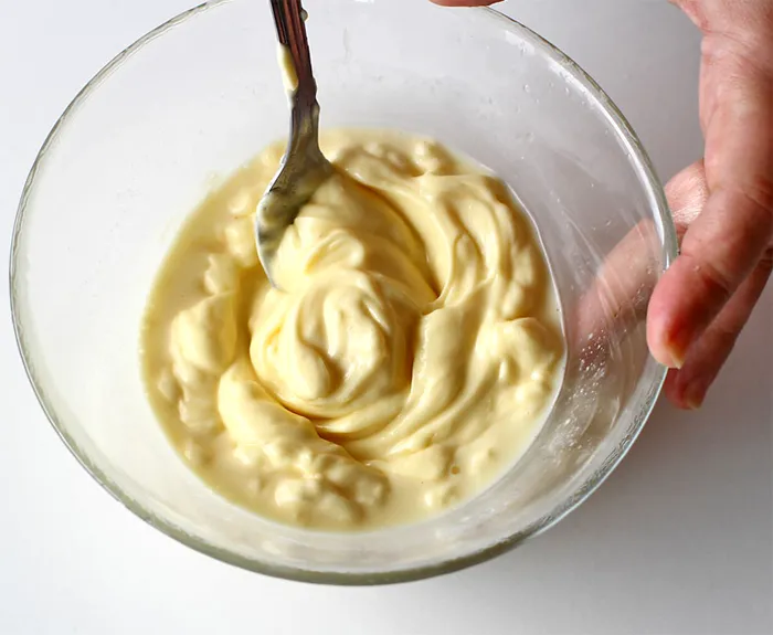 Se adaugă apoi sarea, piperul și câteva linguri de muștar. Se lasă totul deoparte șu se se prepare 500 grame de maioneză. Se pune în salată 3/4 din maioneză și se amestecă. După ce compoziția s-a omogenizat, se poate aranja pe platouri, iar cu ultimul sfert de maioneză rămas și cu alte legume se decorează salata.