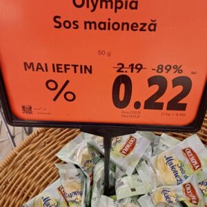 Un plic de maioneză de 50 de grame de la brandul românesc Olympia se vinde cu doar 0,22 lei (sau 22 de bani), după o reducere de 89%, ce reprezintă adaosul comercial practicat de retailer.