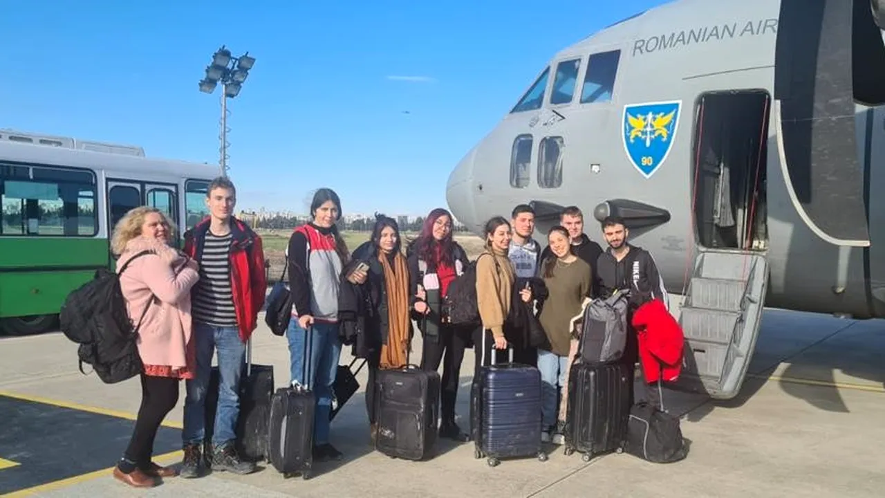Alți 13 cetățeni români, între care doi minori, au fost îmbarcați marți seara la bordul unei aeronave C-27J Spartan a Forțelor Aeriene Române, de pe Aeroportul din Adana, Republica Turcia și se află în zbor spre Aeroportul Otopeni, unde vor ajunge în jurul orei 22.15. Din grup fac parte o mamă cu doi copii, precum și nouă studenți și profesorul coordonator, anunță Ministerul Afacerilor Externe (MAE).