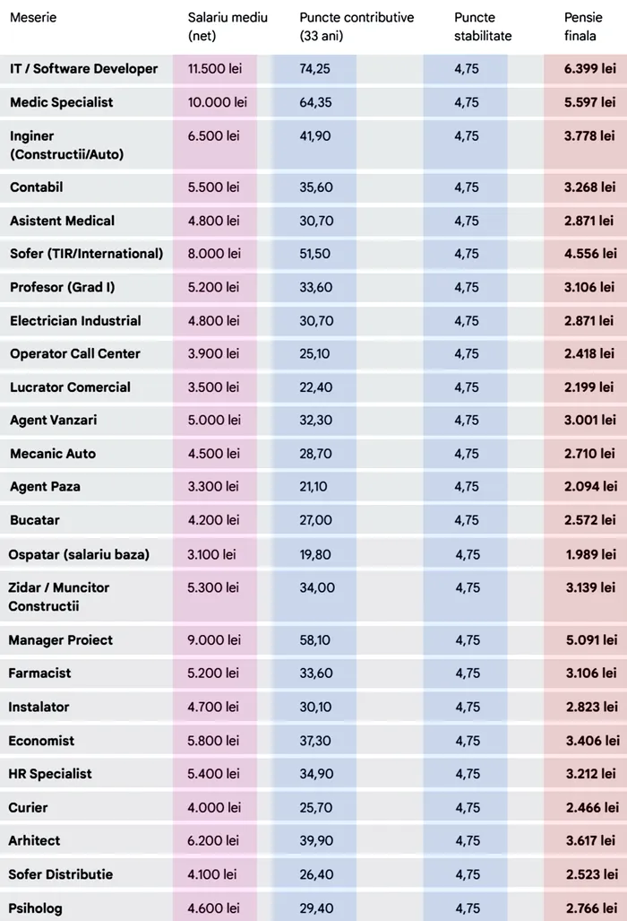 Profesiile cu venituri peste medie rămân și la pensie în topul câștigurilor. Astfel, un specialist IT s-ar putea aștepta la o pensie de peste 6.300 lei, în timp ce un medic specialist, la aproximativ 5.600 lei. Aproape de acest nivel se situează și managerii de proiect sau șoferii de TIR, căci la ei veniturile ridicate se reflectă direct în punctajul acumulat.