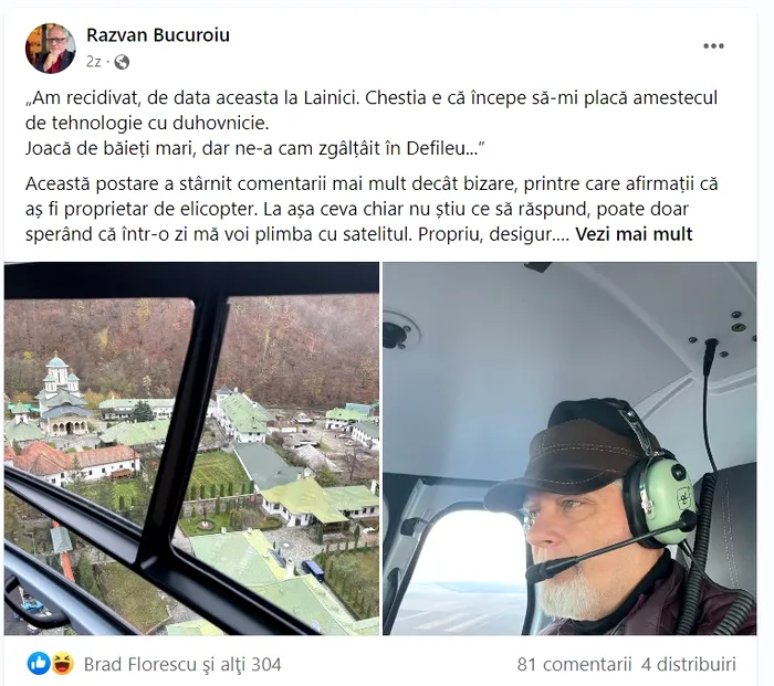 „Am recidivat, de data aceasta la Lainici. Chestia e că începe să-mi placă amestecul de tehnologie cu duhovnicie. Joacă de băieți mari, dar ne-a cam zgâlțâit în Defileu”, a fost mesajul postat inițial de Răzvan Bucuroiu pe pagina de Facebook.