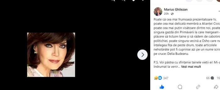 Jurnalistul Marius Ghilezan a postat și el un mesaj despre Delia Budeanu, rememorând noblețea discuțiile pe care ea avea cu cea despre care spune că i-a îndrumat primi pași în gazetărie,