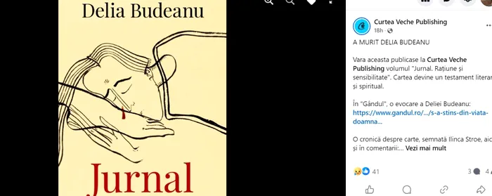 Editura Curtea Veche Publishing, unde Delia Budeanu a lansat în această vară a doua sa carte, numită „Jurnal. Rațiune și sensibilitate” – în cadrul căreia a inclus și amintiri prețioase din copilărie – postat un mesaj pe pagina de facebook.