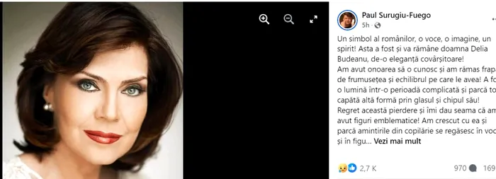 Am crescut cu ea și parcă amintirile din copilărie se regăsesc în vocea și în figura ei! Toate acestea erau dublate de blândețe, de inteligență și de un spirit înalt! Sunt mândru cumva ca pășesc pe holuri televiziunii în care Delia Budeanu a scris istorie! O filă pleacă zilele astea, dar se rescrie permanent, pentru totdeauna! Rămas bun, Delia Budeanu!”, a scris Paul Surugiu.