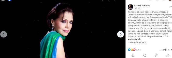 Marina Almășan, realizat și prezentator al TVR, a postat un mesaj sublim despre Delia Budeanu, pe care a cunoscut-o și despre a înțeles cât era de frumoasă, talentată și profundă, căutând mereu să se reinventeze.