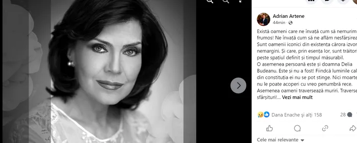 Și jurnalistul Adrian Artene, director editorial Gândul, a publicat un mesaj-omagiu după dispariția Deliei Budeanu, despre care susține că este un om-iconic, trăitor peste spațiu și timp.