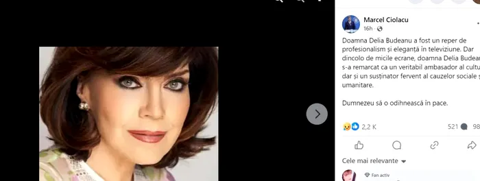 Premierul Marcel Ciolacu a reacționat și el pe facebook, mărturisind că Delia Budeanu a fost un reper de profesionalism și eleganță în televiziune.