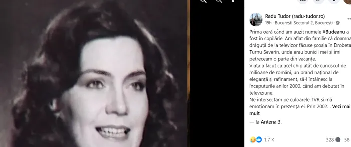 În presa scrisă am fost la un moment dat coleg – în anii ’90 – și cu soțul ei, un consacrat jurnalist de politică externă, Radu Budeanu. După atâția ani de televiziune, numele Budeanu îmi aduce mereu aminte de un reper al bunului simț, eleganței, profesionalismului, armoniei, zâmbetului, exprimării civilizate și impunerii respectului. Budeanu. Delia Budeanu. Dumnezeu să o odihnească!”, este mesajul postat de Radu Tudor.