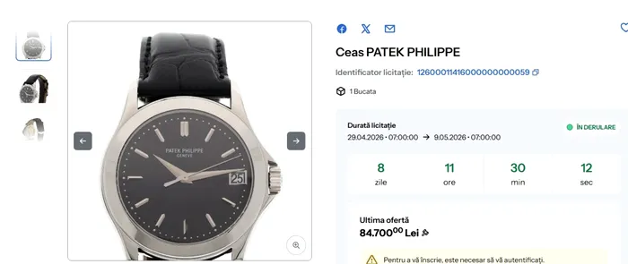 Obiectul a fost evaluat la suma de 80.000 de lei şi este prezentat alături de câteva detalii tehnice: referință de carcasă, calibru mecanism, materialele componente, starea de conservare și necesitatea unei revizii. Au fost menționate inclusiv condițiile speciale de vizionare, deoarece obiectul se află în tezaurul Trezoreriei București.