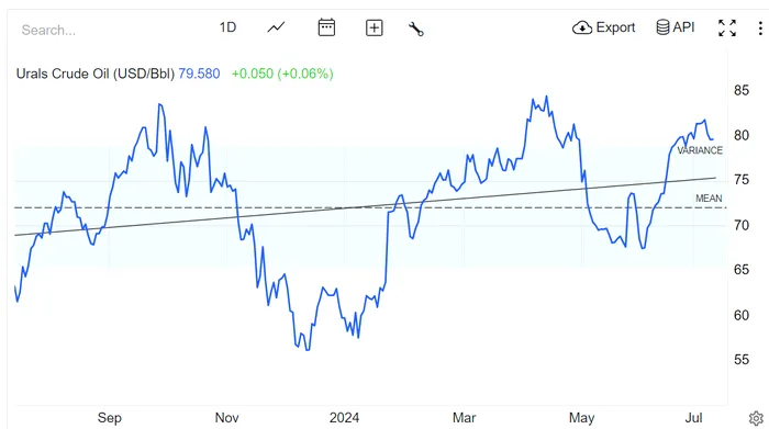 „Firma de analiză Argus aprecizat că, în perioada mai-iunie 2024, prețul mediu al țițeiului rusesc Ural (n.red. – amestec de ulei acru greu din Urali și regiunea Volga cu ulei ușor din Siberia de Vest) a fost între 65-68 dolari pe baril.