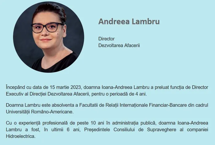 Andreea Lambru, născută în 1985 și absolventă a universității Româno-Americane, a fost plasată în conducerile mai multor companii din sectorul energetic.