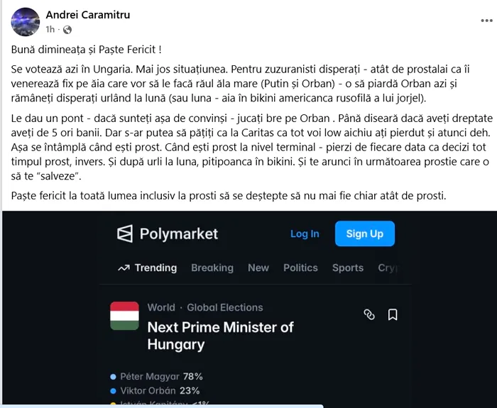 În continuare, analistul economic își exprimă satisfacția că actualul premier maghiar Viktor Orban va pierde alegerile. Aduce ca argument cotațiile Polymarket.