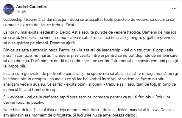 „E ca și cum generalul de pe front e paralizat și nu spune nici să ataci, nici să te retragi, nici să mergi în stânga nici in dreapta – spune eu ce să fac hai vorbiți între voi să vedem ce facem nu știu analizăm vedem aualeu. Ce să fac – exista opinii și opinii – trebuie să îi ascultăm pe toți. În timp ce inamicul îți cară bombe în cap. Și – evident – cei de la vârf scad rapid spre zero ca încredere pentru ca nu își fac jobul. Rolul lor devine toxic nu pozitiv. Nu e bine deloc. Și stilul ăsta e deja de prea mult timp – de la al doilea mandat al lui kwi. De asta am ajuns în așa moment de dificultate. Și lucrurile nu se ameliorează deloc.”