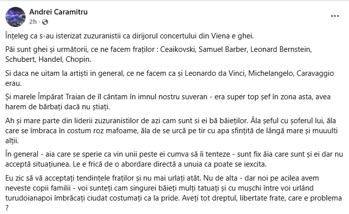 În postare, Caramitru afirmă că nu înțelege isteria care s-a declanșat și atrage atenția că orientarea sexuală nu are nicio legătură cu valoarea artistică sau culturală a unui eveniment de asemenea anvergură. Acesta reamintește numele altor artiști consacrați precum Ceaikovski, Leonard Bernstein, Schubert, Handel sau Chopin și subliniază că orientarea lor sexuală nu a schimbat în niciun fel importanța operei lor.
